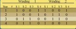 首先,要給腳1B和2B施加一個正電壓,并將1A和2A接地。然后,給腳1B和2A施加一個正電壓,而將1A和2B接地,這一過程其實取決于導線繞齒槽纏繞的方向,假設導線纏繞的方向與上一節(jié)所述相符。依次進行下去,我們就得到了表1中總結的激勵順序,其中,“1”表示正電壓,“0”表示接地。