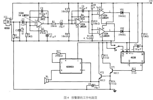 在該探測(cè)技術(shù)中,所謂“被動(dòng)”是指探測(cè)器本身不發(fā)出任何形式的能量,只是靠接收自然界能量或能量變化來完成探測(cè)目的。被動(dòng)紅外報(bào)警器的特點(diǎn)是能夠響應(yīng)入侵者在所防范區(qū)域內(nèi)移動(dòng)時(shí)所引起的紅外輻射變化,并能使監(jiān)控報(bào)警器產(chǎn)生報(bào)警信號(hào),從而完成報(bào)警功能。圖4所示是該報(bào)警器的工作電路原理圖。