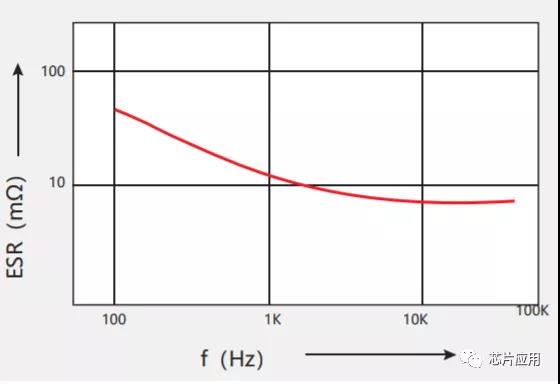 紋波電流的頻率修正系數(shù) , 將影響壽命的各頻率下的紋波電流應(yīng)力設(shè)定為同等 , 是非常具有意義的數(shù)值。紋波動(dòng)電流引起的發(fā)熱產(chǎn)生影響的電阻值(等效串聯(lián)電阻 ,ESR), 如下圖所示 , 呈現(xiàn)一旦頻率升高就會(huì)下降的傾向。因此 , 頻率越高 , 紋波電流就越易于流過。