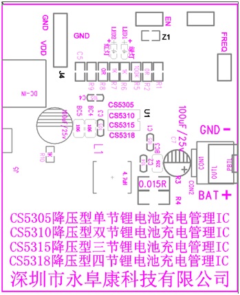 深圳市永阜康科技有限公司結(jié)合客戶實(shí)際應(yīng)用方案,推出管腳兼容的單節(jié)/兩節(jié)/三節(jié)/四節(jié)鋰電池同步降壓型充電管理芯片系列:CS5305/CS5310/CS5315/CS5318,耐壓高達(dá)28V。該系列芯片具有頻率抖動(dòng)的功能,大大改善系統(tǒng)的EMI特性;充電電流最高可達(dá)3A,效率90%以上;全系列型號(hào)都具備完整的涓流,恒流,恒壓充電過(guò)程;具有終止電流可編程功能,通過(guò)設(shè)置不同的外部分壓電阻, 可以很方便的調(diào)節(jié)充電終止電流的大;各種安全可靠的保護(hù)措施以及雙LED燈充電狀態(tài)指示,還帶了NTC溫度控制功能;全系列芯片采用獨(dú)有的EQA-16封裝,尺寸與SOP-8大小相當(dāng)。廣泛應(yīng)用于按摩儀、榨汁機(jī)、藍(lán)牙音響、廣場(chǎng)舞音響、無(wú)人機(jī)等案列。
