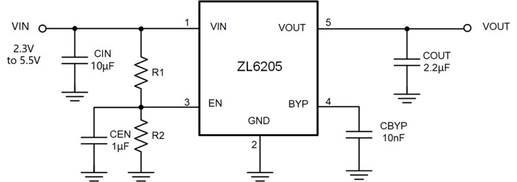 對于上下電需要一步到位的供電系統(tǒng),可以使用下圖6這樣的電路。因為ZL6205帶使能引腳,有著相對穩(wěn)定的使能電壓閾值。通過不同比例的分壓電阻可以設置芯片上電啟動電壓值和掉電輸出關閉電壓。