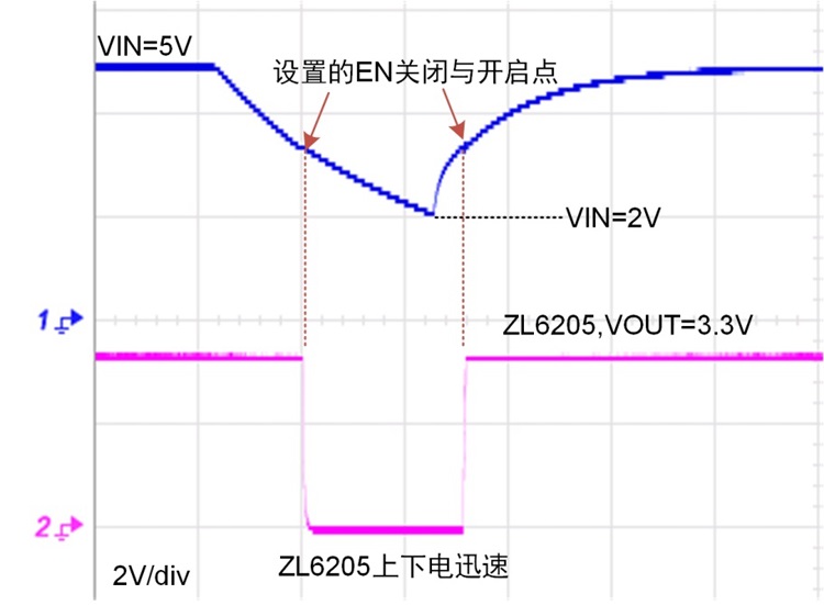 假如使用EN腳使用電阻分壓設置上電使能電壓值(如上圖6,具體EN實際使能電壓詳見ZL6205數(shù)據(jù)手冊),上電和掉電過程就會如圖7所示,藍色為ZL6205的輸入電壓,粉色為ZL6205輸出電壓。當輸入電壓跌落到了設置的關閉電壓值,ZL6205的輸出快速掉電。當輸入電壓上升到設置的電壓值時,ZL6205快速啟動。上下電過程中,輸出都沒有跟隨輸入的階段,掉電和上電都是一步到位,這樣的上下電速度是完全滿足MCU的上電要求的。