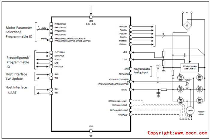 • Flexible host interface options for motor control commands: UART, PWM or analog input signal