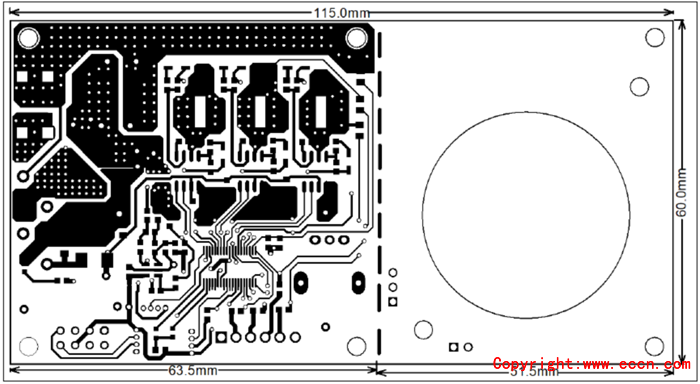 • PCB is 60 mm × 115 mm (or 60 mm × 63.5 mm if cooling fan is removed), 2 layers, 1 oz. copper