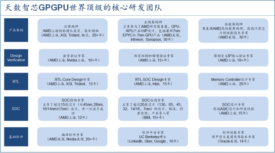 天數(shù)智芯就是這樣一家公司。天數(shù)智芯的芯片研發(fā)團(tuán)隊(duì)于2018年初組建,數(shù)十名創(chuàng)始團(tuán)隊(duì)主要來自世界知名芯片公司AMD的GPU部門和企業(yè)軟件翹楚Oracle、IBM、英偉達(dá)等公司。完整的芯片設(shè)計(jì)團(tuán)隊(duì)在芯片設(shè)計(jì)領(lǐng)域平均積累了近十年經(jīng)驗(yàn),可以說,這是一支在世界范圍內(nèi)都不可多得的、完善的高端芯片設(shè)計(jì)隊(duì)伍。