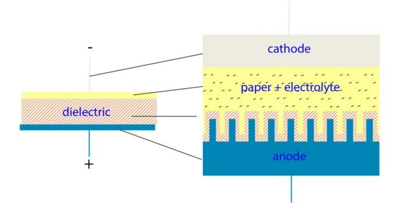 所有電容器都由兩層導(dǎo)電材料(或電極)組成,這兩層導(dǎo)電材料則由介電材料制成的一個絕緣體隔開。這些層之間會產(chǎn)生一個電場,當(dāng)有電流給電容器充電時,它就可以存儲能量。鋁電解電容器的特點是它的電極由鋁箔制成, 而導(dǎo)電液體, 即電解液置于兩個鋁箔電極之間。通過電化學(xué)反應(yīng),在陽極上箔會形成氧化層(Al2O3),它在鋁電解電容器中充當(dāng)電介質(zhì)。