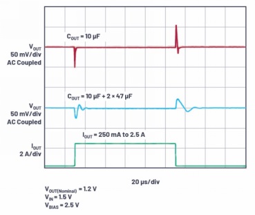 圖2.LT3072的單輸出超快瞬態(tài)響應(yīng)顯示只需使用10 µF (1 µF + 2.2 µF + 6.8 µF)輸出電容即可實(shí)現(xiàn)微秒建立時(shí)間。中間的跡線顯示可使用額外的電容來(lái)限制偏移振幅,但建立時(shí)間略長(zhǎng)。