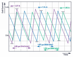 圖2.受開關(guān)頻率變化影響的峰到峰線圈電流紋波