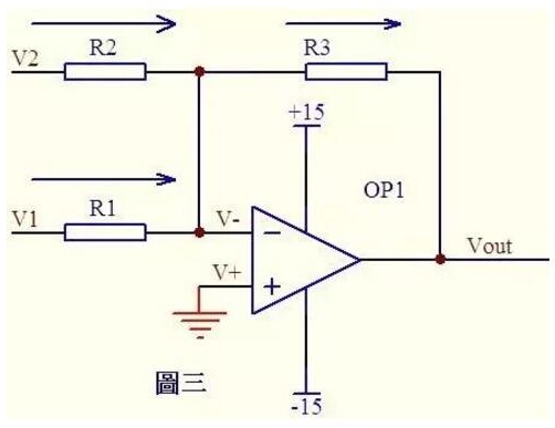 圖三中,由虛短知:V-=V+=0……a由虛斷及基爾霍夫定律知,通過R2與R1的電流之和等于通過R3的電流,故(V1–V-)/R1+(V2–V-)/R2=(Vout–V-)/R3……b代入a式,b式變?yōu)閂1/R1+V2/R2=Vout/R3如果取R1=R2=R3,則上式變?yōu)閂out=V1+V2,這就是傳說中的加法器了。