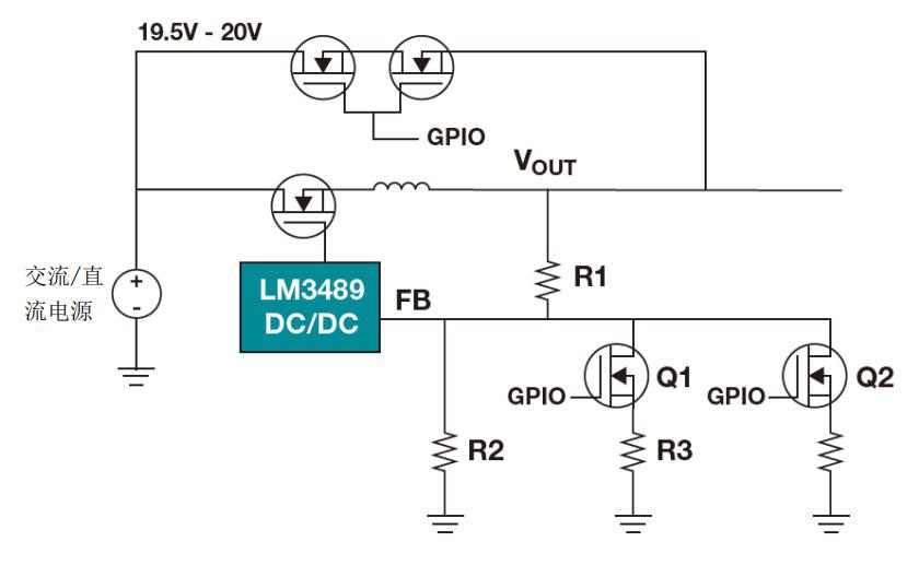對于這個具體的設(shè)計示例,我會使用 TI 的 LM3489 磁滯 p 溝道 FET(PFET)控制器。該集成電路(IC)允許外部 PFET 上 100%的占空比,可直接從 AC/DC 轉(zhuǎn)換器通過外部 19.5 V。市場上大多數(shù) USB PD 控制器都具有通用輸入/輸出(GPIO),用于控制外部穩(wěn)壓器輸出電壓。PD 控制器可以通過調(diào)節(jié)降壓的反饋網(wǎng)絡(luò)來調(diào)整 LM3489 DC/DC 降壓轉(zhuǎn)換器的輸出電壓。