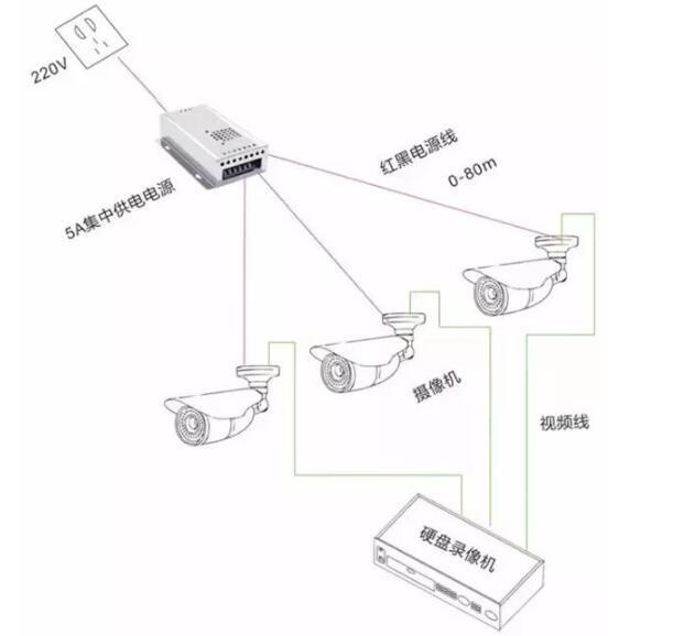 通常懂的人都知道集中供電模式是在 220V 電源處接 12V 集中電源一個(gè),再用 2*1.0 紅黑電源線分別接給攝像頭,12V 供電距離不可超過(guò) 100 米。在接個(gè)單個(gè)電源線接頭,再把單個(gè)電源線接頭和監(jiān)控?cái)z像頭電源接頭相連接即可。集中供電方式是指在監(jiān)控室或某個(gè)中間點(diǎn)采用 12V 開(kāi)關(guān)電源向前端負(fù)載集中供電。與獨(dú)立供電模式相比,最大的差別在于一個(gè)電源可以為多個(gè)攝像機(jī)提供電力供應(yīng)。