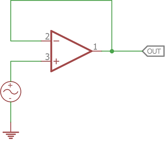我們來看下面的放大器電路。這是一個簡單的負(fù)反饋同相運放電路。這種配置方式為單位增益跟隨器。