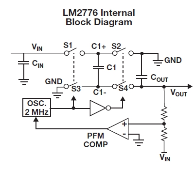 電荷泵芯片通常內(nèi)部組成主要為電容和開(kāi)關(guān),通過(guò)開(kāi)關(guān)的開(kāi)啟關(guān)閉來(lái)控制電荷泵內(nèi)部電容的充放電(即開(kāi)關(guān)電容)來(lái)產(chǎn)生負(fù)輸出電壓。以下為 LM2776 的內(nèi)部結(jié)構(gòu)示意圖為例,在充電階段,S1 與 S3 開(kāi)關(guān)閉合 (S2 和 S4 開(kāi)關(guān)為斷開(kāi)狀態(tài)),開(kāi)關(guān)電容被連接在輸入電壓與地之間, 充電電容被充電到輸入電壓 VIN;在放電階段,S2 和 S4 開(kāi)關(guān)閉合 (S1 和 S3 為斷開(kāi)狀態(tài)),此時(shí)開(kāi)關(guān)電容的陽(yáng)極接地,陰極接 VOUT,若負(fù)載電流為 0,VOUT 即為 -VIN。若負(fù)載電流不為 0,計(jì)算 VOUT 的值還需考慮 MOSFET 開(kāi)關(guān)的寄生電阻,電容的 ESR 以及電容充放電時(shí)的電荷損失等。