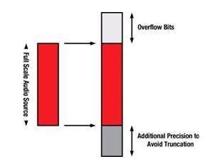 在頂端,共有9個(gè)位,用于防止音頻數(shù)據(jù)意外飽和。例如,如果你使用一個(gè)24-dB增壓的均衡器(EQ),并且你輸入一個(gè)“全量程”16位字,則你可能會(huì)非有意地讓信號(hào)飽和,也即增加失真,而這與我們努力的方向背道而馳。