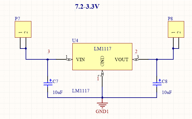 7.2v轉(zhuǎn)3.3v用lm1117效果挺好的,電路如下: