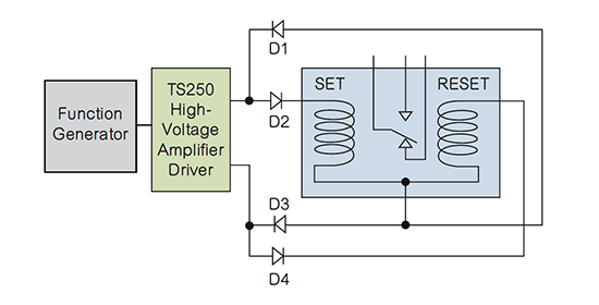 圖3:僅使用一個(gè)函數(shù)發(fā)生器和一個(gè)高壓驅(qū)動(dòng)器來測試雙線圈繼電器。