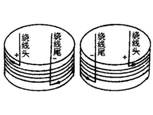 電池“+”極接揚(yáng)聲器“+”端,紙盆或振膜向上推動(dòng)時(shí),電池“+”極觸及的一端為揚(yáng)聲器的“+”極。二是用指針式萬(wàn)用表觸及揚(yáng)聲器的“+、-”極,紙盆向上推動(dòng),紅筆接的一端為揚(yáng)聲器的“-”極,黑表筆接的一端為揚(yáng)聲器的“+”極。三是在場(chǎng)聲器的修理組裝中,可以從音圈的繞線方向來(lái)判斷其極性,見(jiàn)圖。