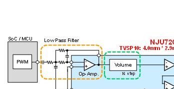 最近,越來越多裝有音頻輸出功能的設備里除了有揚聲器放大器之外,更多需求是想同時使用簡單的音量調(diào)節(jié)功能。我們開發(fā)的這款帶音量調(diào)節(jié)功能的揚聲器放大器NJU72065不光能接收模擬音頻信號,也可以靈活應對從MCU輸出的PWM信號,可縮小系統(tǒng)規(guī)模,簡化系統(tǒng)設計。此外,NJU72065采用的是小型封裝,且僅需配套幾個外接元件構成音頻輸出電路,可有效縮小PCB面積,節(jié)省成本。