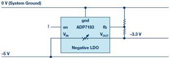 圖2所示的是相同系統(tǒng),但是使用了專為降壓負電壓設(shè)計的線性穩(wěn)壓器。