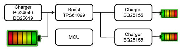 以下我們從續(xù)航的角度給大家推薦TI最新的解決方案。圖一是一個典型的TWS耳機電源框圖,用一顆Iq(靜態(tài)電流)低至600nA的升壓芯片TPS61099將電池電壓升到5V同時給兩個耳機端供電。耳機端電池電壓存在電壓差,這將降低充電效率。