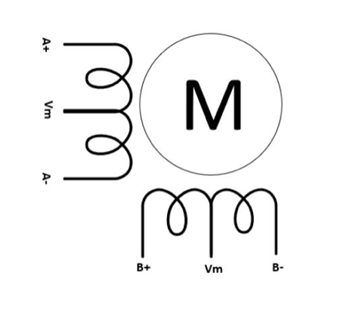 相反,雙極步進(jìn)電機(jī)只有四根導(dǎo)線連到電機(jī)繞組,分別標(biāo)記為A+、A-、B+和B-。如圖3所示,雙極步進(jìn)電機(jī)沒(méi)有中心Vm抽頭。
