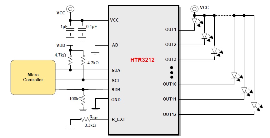 HTR3212是一款12路LED PWM驅(qū)動(dòng)器,PWM頻率可固定為3kHz或22kHz。每一路最大輸出電流可通過外置電阻REXT調(diào)節(jié),最大38mA,并可獨(dú)立控制4檔可選。每一路可通過I2C單獨(dú)控制256級(jí)細(xì)膩亮度調(diào)節(jié)。