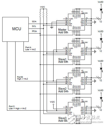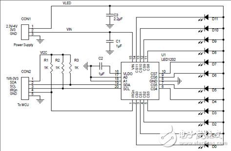 ST公司的LED1202是12路低靜態(tài)電流LED驅(qū)動(dòng)器,保證了5V輸出驅(qū)動(dòng)功能,而每路能提供高達(dá)20 mA和電壓裕度僅為350mV.每路的輸出電流由8位模擬和12位數(shù)字調(diào)光控制來單獨(dú)調(diào)整.慢開時(shí)間和慢關(guān)時(shí)間提高了系統(tǒng)的低噪音性能,而移相功能有助于降低浪涌電流,八種模式存儲(chǔ)在內(nèi)部寄存器而不需要MCU干預(yù)進(jìn)行自動(dòng)定序.器件的1.8V兼容的I²C接口基于快速模式指標(biāo),工作高達(dá)400kHz.工作電壓2.6V-5V,每路的電流能力20mA,16mA時(shí)的12路的電流匹配度1%,2.5mA時(shí)的匹配度2%,8位模擬調(diào)光單獨(dú)控制,12位本地PWM分辨率.LED1202具有LED開路檢測(cè)和超溫保護(hù).主要用在RGB照明如可穿戴電子學(xué),電池供電設(shè)備和手持附件.本文介紹了LED1202主要特性,框圖和驅(qū)動(dòng)器電路框圖,以及評(píng)估板STEVAL-LLL007V1主要特性,電路圖和材料清單.