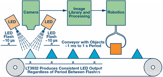 為了實現(xiàn)上述功能, ADI的高速LED驅(qū)動器LT3932可為高達2 A的LED串提供機器視覺相機閃光燈,關斷時間可以長達1秒、1小時、1天或更長時間,從而完美地解決這一問題。LT3932的特殊相機閃光燈功能允許其保持輸出電容和控制環(huán)路充電狀態(tài),哪怕是在長關斷時間內(nèi)。對輸出和控制環(huán)路電容的狀態(tài)進行采樣后,LT3932繼續(xù)在長關斷期間對這些元件進行涓流充電,以補償通常都會有的漏電流,而這是其他LED驅(qū)動器沒有考慮到的。