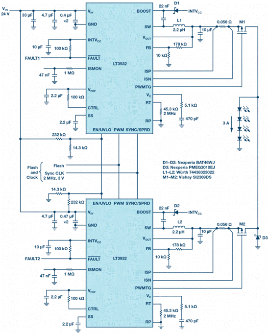 ADI的LT3932專有閃光技術支持擴展,驅(qū)動器可以并聯(lián)以提供更高的LED閃光電流。所需的閃光形狀和完整性保持不變。下圖顯示了并聯(lián)兩個驅(qū)動器從而支持3 A相機閃光燈,甚至高達4 A的設計也是可行的。