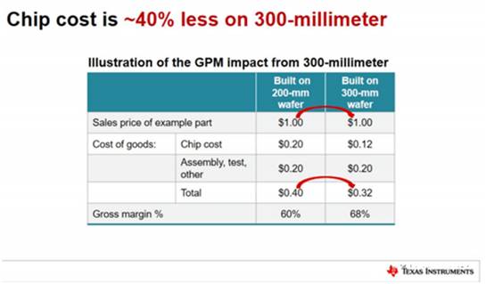 但是,由于其300mm生產(chǎn)的擴(kuò)大,該公司的毛利率在未來幾年可能會(huì)更高。該公司一直致力于通過投資300毫米生產(chǎn)來創(chuàng)造具有競爭力的制造成本優(yōu)勢。管理層表示,在封裝之前,基于300mm晶圓的芯片的成本比200mm晶圓便宜40%。2020年,該公司宣布在得克薩斯州的Richardson建造晶圓制造廠,從而彰顯了其擴(kuò)大300mm制造規(guī)模的承諾。該設(shè)施的預(yù)算總成本為8.5億美元,預(yù)計(jì)到2024年將全部完成,每年從該設(shè)施中帶來50億美元的額外收入。