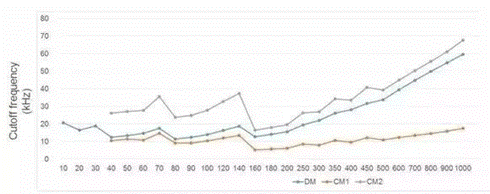 為了說(shuō)明這個(gè)結(jié)論,我給出一些定量分析結(jié)果。這些EMI分析均基于AC/DC三相整流,拓?fù)錇榫S也納整流。我分別給出了1Mhz和500Khz的共模噪聲,可以看出,500khz共模濾波器需要的截止頻率為19.2kHz,1MHz為31.2kHz。