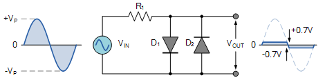 如下圖所示,當(dāng)在正半周期,并且VIN大于等于0.7V,二極管正向?qū)ā4藭r(shí),VOUT會(huì)被鉗位在0.7V上。