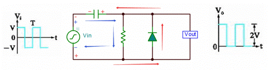 當(dāng)所加的偏壓與二極管導(dǎo)通方向一致,鉗位值會(huì)提高V1,Vout=2V+V1。
