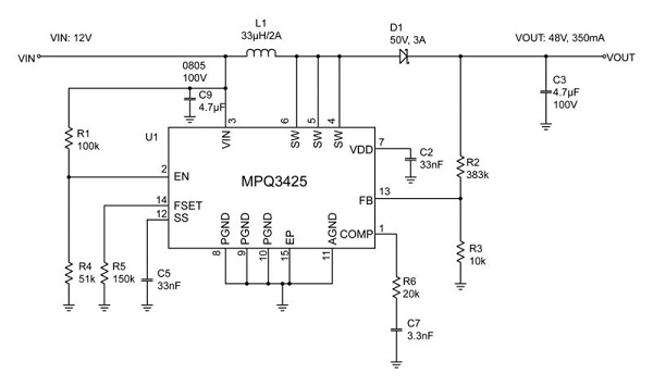 MPQ3425 升壓變換器輸入電壓低至 3.1V,可從 12V 轉(zhuǎn)換高達(dá) 48V 的輸出電壓和 350mA 的輸出電流。全方位保護(hù)功能包括欠壓鎖定保護(hù)(UVLO)、限流保護(hù)和熱過載保護(hù)。