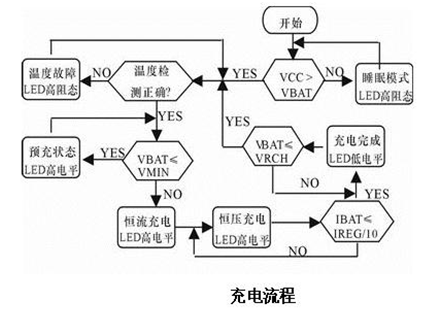 典型的充電方式是:先檢測待充電電池的電壓,在電池電壓較低情況下,先進行預(yù)充電,充電電流為設(shè)定的最大充電電流的1/10,當(dāng)電池電壓升到一定值后,進入標(biāo)準(zhǔn)充電過程。標(biāo)準(zhǔn)充電過程為:以最大充電電流進行恒流充電,電池電壓持續(xù)穩(wěn)定上升,當(dāng)電池電壓升到接近設(shè)定的最大電壓時,改為恒壓充電,此時,充電電流逐漸下降,當(dāng)電流下降至最大充電電流的1/10時,充電結(jié)束。