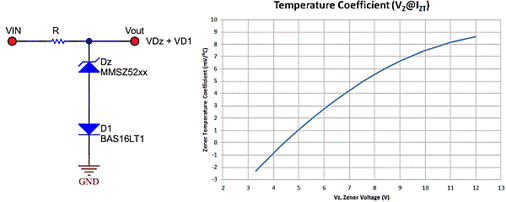 圖1顯示了在齊納二極管電路中串聯(lián)一個(gè)二極管,曲線繪制了齊納二極管的不同電壓對應(yīng)的溫度系數(shù)。當(dāng)穩(wěn)壓二極管電壓大于4.7V時(shí),溫度系數(shù)逐漸變?yōu)檎龜?shù),因此當(dāng)工作溫度升高時(shí),齊納二極管電壓隨之升高。如果與溫度系數(shù)為負(fù)值的二極管配對,通過降低二極管正向電壓,齊納二極管增加的電壓會(huì)被抵銷,從而消除溫度誤差。