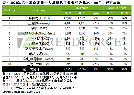 盡管整體產(chǎn)業(yè)歷經(jīng)2020年第四季的高基期、突發(fā)性停電意外等外部因素影響,2021年第一季前十大晶圓代工業(yè)者總產(chǎn)值仍再次突破單季歷史新高,達(dá)227.5億美元,季增1%。
