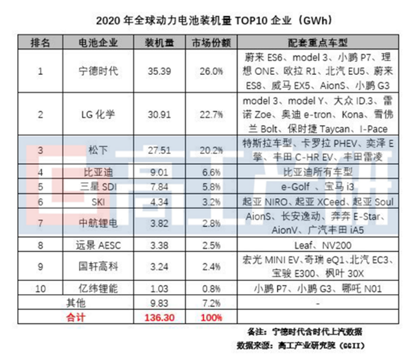 通過 2020 年全球動(dòng)力電池裝機(jī)量 TOP10 排行就能夠看得出來,寧德時(shí)代、LG 化學(xué)以及松下這三家動(dòng)力電池供應(yīng)商分別以 35.39GWh、30.91GWh、27.51GWh 的裝機(jī)量占據(jù)了全球 68.9% 的動(dòng)力電池市場份額。