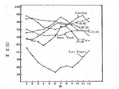 以上兩種情況是針對(duì)人體在接觸到電子產(chǎn)品時(shí),因人體帶電或其他原因引起電子產(chǎn)品不能工作而進(jìn)行的基本測(cè)試。下圖是一些地區(qū)在一年中不同月份的空氣濕度統(tǒng)計(jì)。從圖中可以看出Lasvegas全年的濕度 少,該地區(qū)的電子產(chǎn)品要特別注意ESD的保護(hù)。