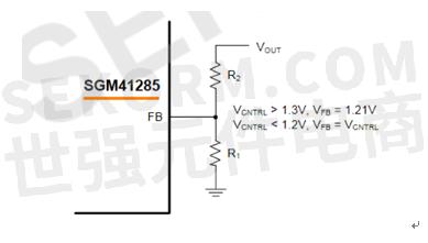 2、輸出電壓設(shè)置。SGM41285輸出電壓通過FB引腳與GND之間分壓電阻進行設(shè)置,如圖2所示。R1(R1與GND之間)一般選擇 5 kΩ和10 kΩ之間,然后利用下式計算R2(Vout與FB之間):