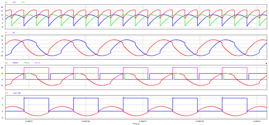 上述 圖中可以看出前級開關(guān)管均實(shí)現(xiàn)了ZVS,副邊實(shí)現(xiàn)了ZCS(圖4中情況除外),半橋相位關(guān)系如圖5所示。