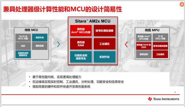 下圖可以看出,Sitara™ AM2x 具備MPU的高性能內核,可實現更高的處理能力,另外在邊緣端實現實時控制、工業(yè)通訊、分析處理、功能安全和信息安全,借助TI簡易的硬軟件工程師可快速開發(fā)高性能系統(tǒng),降低系統(tǒng)總體設計復雜性和成本,并輕松獲得高性能處理能力。