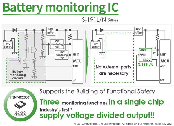 此外,S-191L/N系列通過提供低電壓(通常為導(dǎo)致ECU不穩(wěn)定或故障的原因)和過壓(可損壞ECU)監(jiān)測功能來確保更高的安全 性。