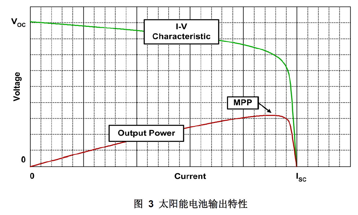 在大多數(shù)應(yīng)用中,人們都期望太陽能電池能提供盡可能多的電能。由于輸出功率是輸出電壓和電流的乘積,因此就必須確定電池工作區(qū)域中的哪一部分所產(chǎn)生的VI值最大。這一點被稱為最大功率點(MPP)。當(dāng)輸出電壓為其最大數(shù)值(VOC)時,輸出電流為零,這是一個極端情況;而當(dāng)輸出電流達(dá)到最大值(ISC),但輸出電壓為零時,則是另一種極端情況。在這兩種情況下VI的乘積均為零,因此,這兩種極端情況肯定都不是MMP點。我們可以很容易證明(或通過實驗進(jìn)行觀察),在任何應(yīng)用中,MPP一般會出現(xiàn)在太陽能電池輸出特性(請參見圖3)下半部分的某個位置。但問題是太陽能電池MPP的確切位置會因入射光線和環(huán)境溫度不同而變化。所以,設(shè)計旨在動態(tài)地調(diào)節(jié)太陽能電池的輸出電流,以達(dá)到太陽能電量生成系統(tǒng)的最大化,以便在實際應(yīng)用中其能夠在MPP點或者其臨近點工作。