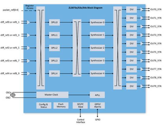 這款最新平臺配備五個超低抖動合成器,可提供最新的5G RU、DU和CU系統(tǒng)的高速接口所需的100飛秒(fs)均方根(rms)抖動性能。