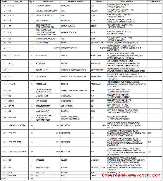評(píng)估板MAX22203 EVK材料清單: