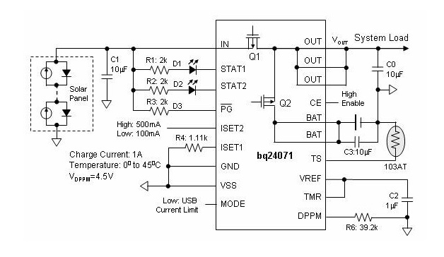 圖中太陽(yáng)能電池板提供的最大輸出電壓 (VOC) 通常在 5.5V~6.0V 之間。由于該電壓低于預(yù)定義的 6V 輸出調(diào)節(jié)電壓,因此 MOSFET Q1 完全打開(kāi)。如果系統(tǒng)和電池充電器所需的總電流超過(guò)太陽(yáng)能電池根據(jù)光照量決定的輸出電流,那么太陽(yáng)能電池板的輸出電壓將降低,從而減小輸出電壓 (VOUT)。當(dāng) VOUT 降至 VDPPM 時(shí)(也是太陽(yáng)能電池板的輸出電壓),充電電流降低。如 VDPPM 設(shè)置靠近 MPP 的話,那么太陽(yáng)能電池板這時(shí)將工作在靠近 MPP 的位置。我們通過(guò)對(duì) RDPPM 進(jìn)行適當(dāng)編程,使其達(dá)到一定的值,確保 VOUT 保持最小為 4.5V,從而實(shí)現(xiàn)上述目的。我們之所以使用 VDPPM 的值,是因?yàn)樗侠淼貙?duì)應(yīng)于太陽(yáng)能電池板的 MPP。