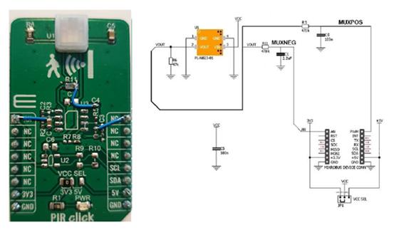 注:圖中展示了在PIR click的基礎(chǔ)上進(jìn)行修改的示例,因?yàn)檫@種修改比設(shè)計(jì)新的PCB并獲取所需元件更為方便。修改后的解決方案與click板的用途并不沖突。