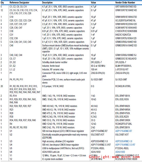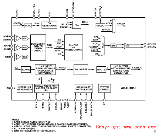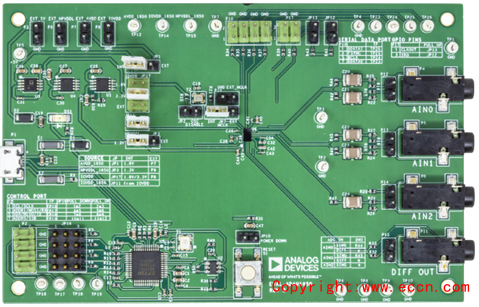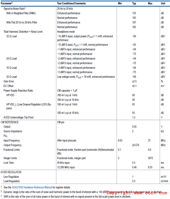 ADI公司的ADAU1850是具有三個輸入和一個輸出的集成了數字信號處理器的編譯碼器(CODEC).從模擬輸入到DSP核到模擬輸出的通路經過優(yōu)化,具有低等待時間,非常適合于降噪音耳機使用.只需要增加少許無源元件, ADAU1850提供了完整的耳機解決方案. ADAU1850具有可編程的FastDSP音頻處理引擎,高達768kHz取樣速率,具有Biquad濾波器,限幅器,音量控制和混合等功能,低等待時間的24位ADC和DAC,106dB SNR(信號通過ADC和A加權濾波器),串口取樣速率從8kHz到768kHz,模擬到模擬群時延為5 μs,可編程雙精度MAC引擎用于13級均衡器,3個模擬輸入(2個差分和一個單端),可配置成麥克風或線輸入.模擬差分風音頻輸出,可配置成線路輸出或耳機驅動器,PLL支持30 kHz到27 MHz的任何輸入時鐘,1路ASRCI,三路ASRCO,串行音頻端口支持I2S,左對齊,或高達16路TDM (TDM16),具有靈活路經的兩個插值器和4個抽取器.模擬AVDD電源電壓為1.8V.數字I/O IOVDD電壓為1.8V到3.3V.通信接口為I2C,SPI和UART.采用28點0.4mm間隔2.957 mm × 1.757 mm WLCSP封裝.主要用在降噪手機和耳機,藍牙有源降噪(ANC)手機和耳機,PND,數字照相機和攝影機,樂器效果處理器,多媒體揚聲器系統(tǒng)和智能手機.本文介紹了ADAU1850主要特性,功能框圖和模擬性能指標,以及評估板EVALADAU1850EBZ主要特性,框圖,電路圖和材料清單.