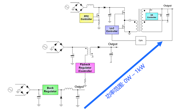 MPS可以提供0-1000W全系列的AC-DC電源解決方案,從1W輸出的智能LDO和Buck非隔離方案,到10W輸出的非隔離降壓方案,MPS均有集成功率管的解決方案。對(duì)于小功率隔離反激方案,MPS也有集成功率管和控制器的方案提供。最后到大功率的LLC方案,在75W輸出以上,比較常用的PFC+LLC架構(gòu),MPS有獨(dú)立的PFC控制器和LLC控制器提供。